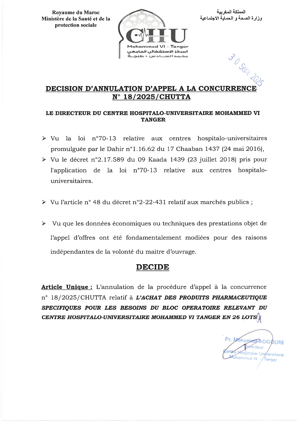 DECISION TO CANCEL CALL FOR TENDERS N° 18/2025/CHUTTA